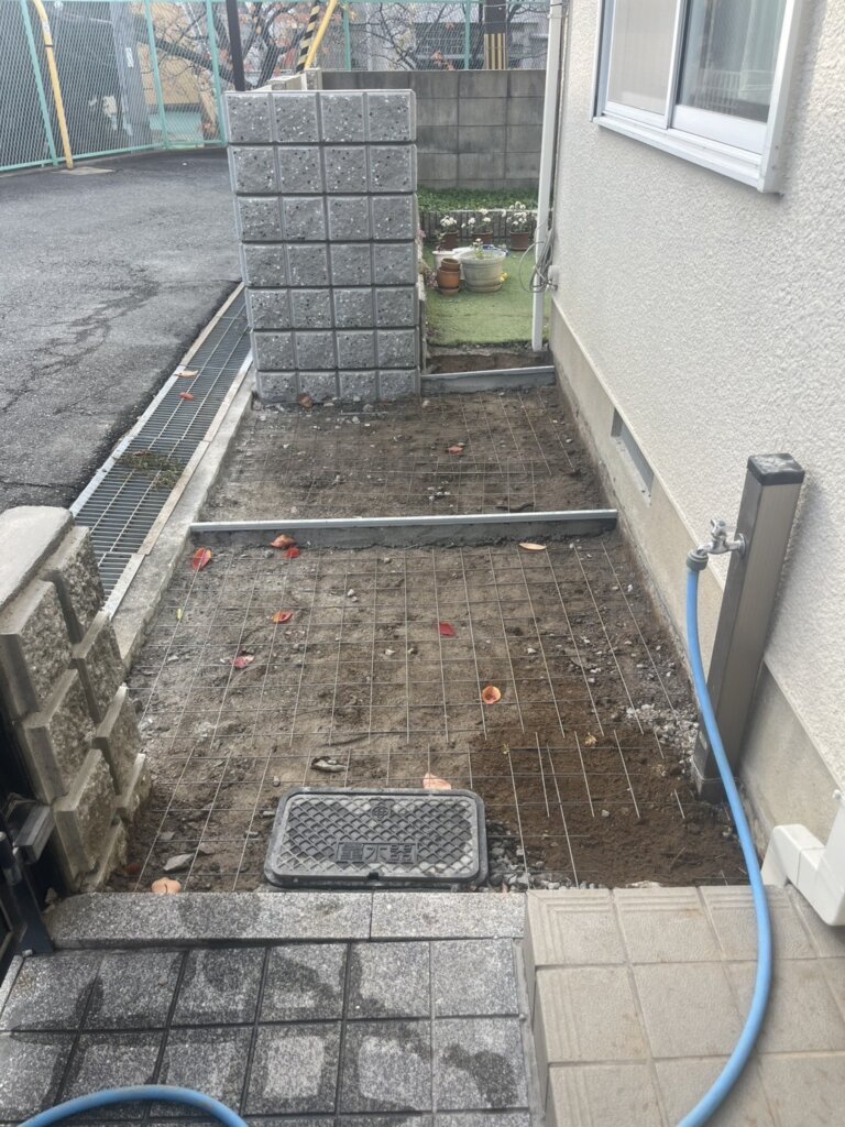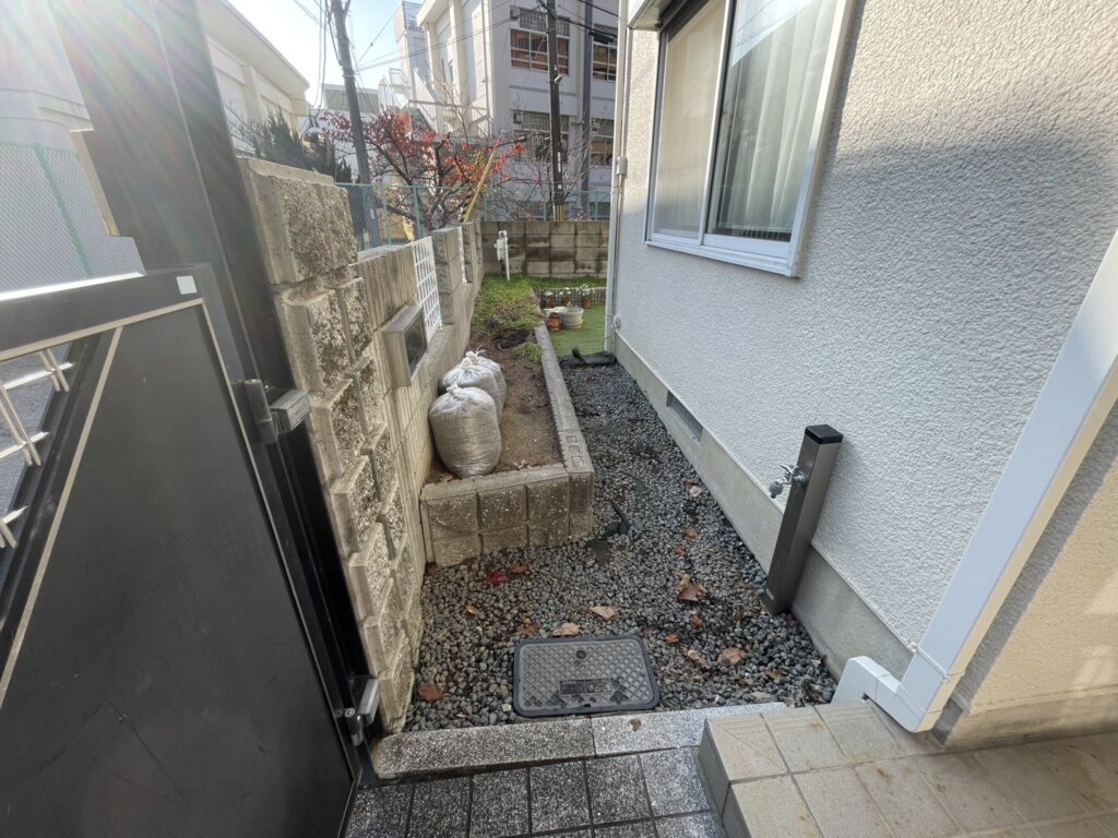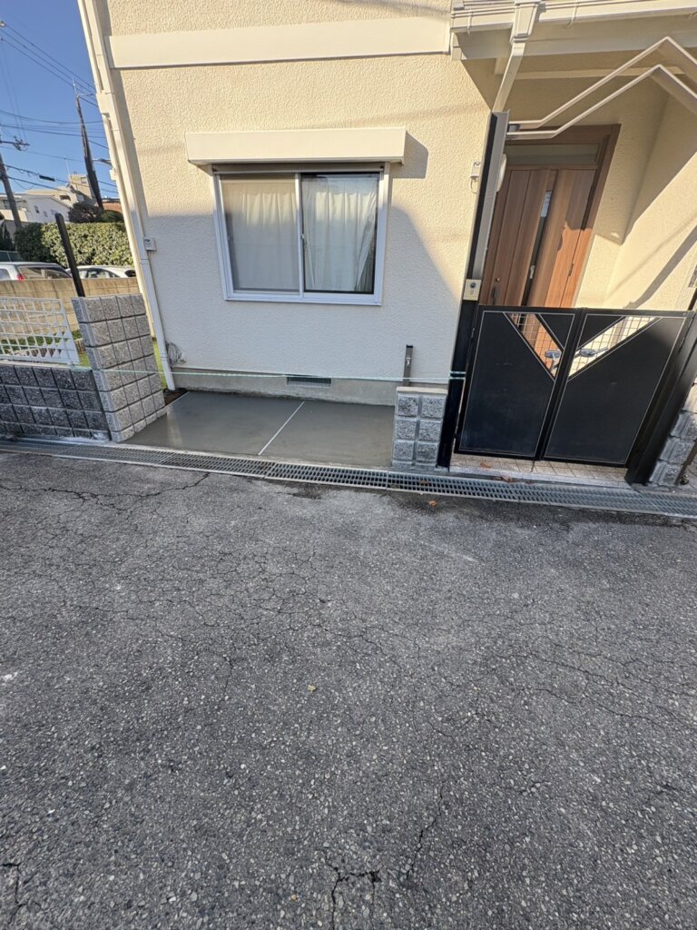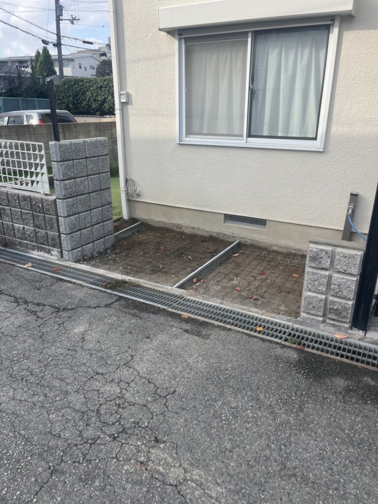 今回は、長年使用されていなかった花壇やブロック塀を撤去し、土間コンクリートを新設する施工を行いました。不要になった花壇などを撤去することで、外構全体がスッキリし使い勝手の良いスペースを確保できました。土間コンクリートは雑草対策にもなりお手入れが楽なうえ、自転車置き場・物置スペースなど幅広く活用できるのもメリットです。